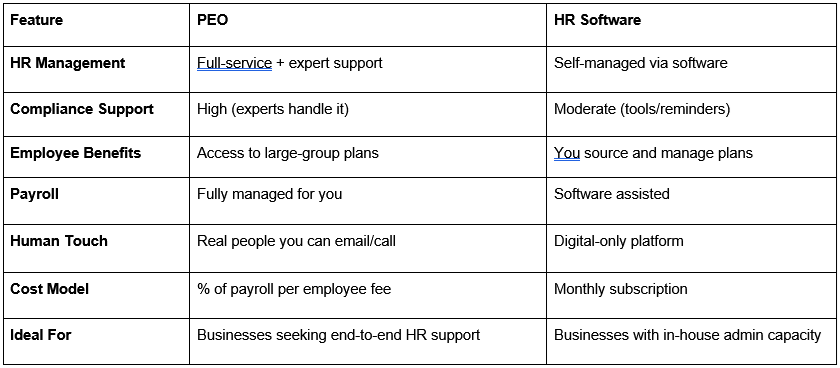 The bottom line? A PEO handles HR for you, while HR software helps you handle it yourself.