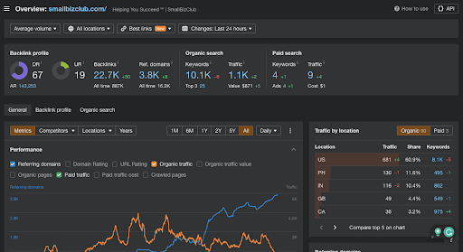 Site authority is a crucial factor that search engines use to determine how well a website should rank in search results. Website authority is also commonly referred to as “domain authority” (DA), or “domain rating” (DR), which is an Ahrefs metric. An example of a relatively high-DR site would be smallbizclub; their domain rating is 67 according to Ahrefs.