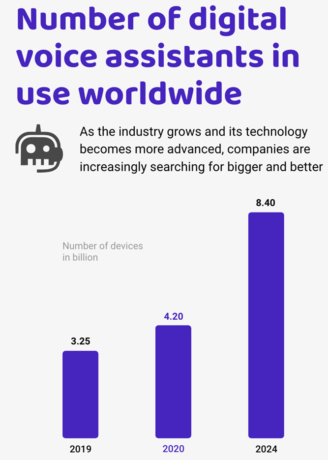 Voice-enabled devices, including AI assistants, are revolutionizing the way we interact with technology, helping to reduce or eliminate touch points. Voice-activated searches now account for nearly half of all searches. Analyst firm Juniper Research forecasts that “nearly 8 billion digital voice-activated devices will be in use by the end of 2023.”