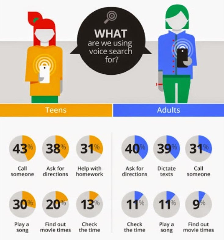 According to a Google report on voice search history, 41% of adults and 55% of teens are now using voice search queries at least once a day. If your business is influenced by demographics, take note of the following graphic. In these natural language processing examples, be mindful of the generational differences. When asked, ‘Pick one thing you wish you could ask your phone to do for you,’ the leading response from teens was ‘send me a pizza.’ From adults? ‘Tell me where my keys are.’