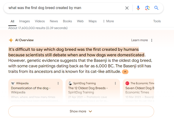 SGE (AI Overviews) is basically an evolution on featured snippets using passage ranking as defined by Liz Reid, head search at Google: “This approach is highly effective. Overall, our tests show that our accuracy rate for AI Overviews is on par with another popular feature in Search — featured snippets — which also uses AI systems to identify and show key info with links to web content.”