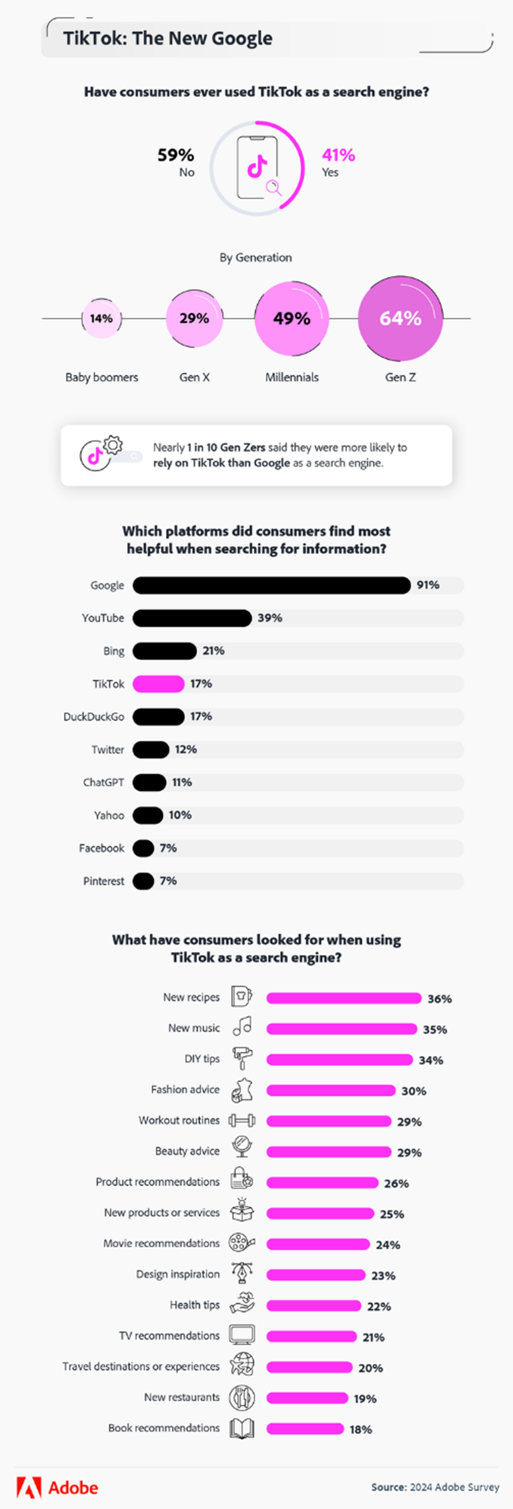 According to a recent report by Adobe, 17% of users surveyed found TikTok the most helpful platform when searching for information. The same report also found that amongst Genz’s, Food, music and travel were three trending topics that consumers searched information on when using the Video sharing platform.